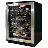 Accommodating up to 58 bottles, this front-venting wine chiller can be freestanding or built-in under a counter. Multi-zones inside the unit create separate areas without losing valuable bottle space. Whites go towards the bottom (colder) and reds go toward the top (warmer). An interior light helps when perusing the selection. In addition, the wine chiller's thermal double-paned glass door can be locked to secure inside contents, and its normal temperature fluctuation of 5 degrees F prevents excessive cycling. The appliance makes for a nice addition to the kitchen, bar, or living area, though it should not be placed in the garage due to volatile external temperature ranges. Attractively housed in stainless steel with brushed aluminum trim, the wine chiller measures 23 by 24 by 34-1/2 inches and carries a one-year limited warranty.Want to learn more information about Vinotemp VT-58 58-Bottle Front-Venting Wine Chiller, Stainless Steel?