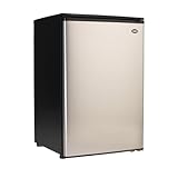 With its roomy 4-8/9-cubic-foot capacity, this counter-high refrigerator comes in handy in a workshop or office or as a second refrigerator at home. The unit's spacious interior features three, adjustable, spill-proof glass shelves and a crisper drawer for fresh fruits and vegetables, as well as storage space in the door that consists of a vertical soda-can dispenser and three shelves for items both small and large (the lower door shelf can hold a 1-gallon milk jug and a six-pack of soda).Thoughtfully constructed, the appliance has earned an Energy Star rating, which means it meets strict energy-efficiency guidelines set by the EPA and U.S. Department of Energy. Energy Star products can help save up to a third on energy bills, as well as greatly reduce greenhouse gas emissions, all of which means the convenience of properly chilled meals, snacks, and beverages without excess costs or impact on the environment. Other highlights include a manual dial for adjusting the thermostat, an easy-to-clean Eclipse series black interior; a clear-coated fingerprint-resistant platinum door with a reversible door hinge (so it can be opened from the left or the right), a smooth space-saving back (no unsightly coils), a durable countertop for additional workspace, and two leveling legs to ensure stability even if placed on uneven ground. The refrigerator measures 22-3/4 by 21-3/8 by 33-3/4 inches.